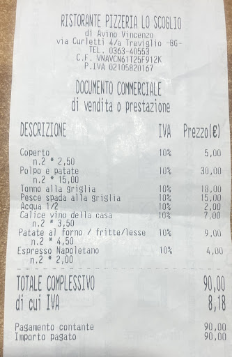 Ci siamo recati, per pranzo, di solito andiamo in altri ristoranti in Treviglio, la prima impressione all’ingresso locale con 6/7 clienti, e già per essere un festivo mi è apparso strano, quindi ordiniamo un antipasto, polipo con patate, scarsissimo erano molte più le patate e la guarnizione di insalata, poi procediamo con il secondo un piatto di spada e tonno alla griglia, mai visto fette così sottili e misere, con un contorno di patatine fritte, con acqua minerale e due caffè, non ci era mai capitato, (in ristoranti di Treviglio) ebbene aggiungo, qualità e portate misere una ciofeca, e prezzo altissimo, metto una stella perché meno non è consentito.Lo...