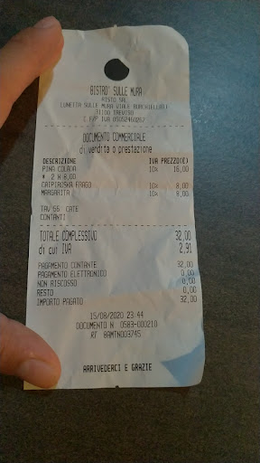 IN RISPOSTA a “BISTRÒ alle MURA”: Io ho fatto presente che il mio semplice “Negroni Sbagliato” non era buono o che probabilmente c’era stato un errore con la comanda ma con molta sufficienza mi è stato risposto: “sullo scontrino c’è scritto il nome del cocktail quindi è quello giusto”. Le focaccine erano proprio secche e non appena fatte, forse sarebbe il caso essere presenti e dare un’occhiata più accurata a quello che viene servito. Comunque vi faccio i complimenti perché il locale è davvero bello..ovviamente qualche sorriso e un po’ di cortesia anche per i clienti occasionali sarebbe...