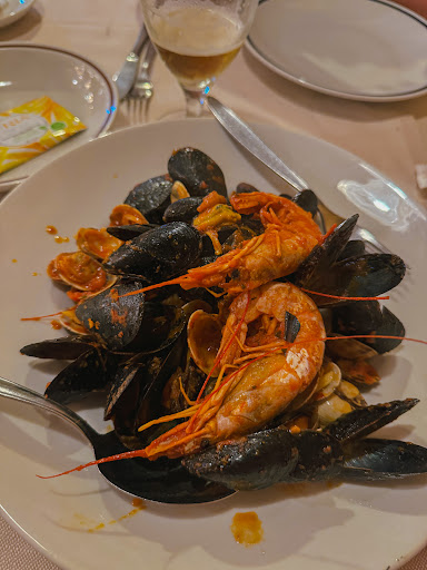 Huge portions of food! We couldn't even finish our pizza after the delicious spaghetti with mussels. There was a young guy who poured our wine and he filled up the glasses up to the top! We had such a great laugh about it and shared one glass. The manager was so nice and professional about the whole situation. We spent less here then in most other places in Italy and we highly recommend ordering...