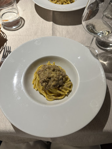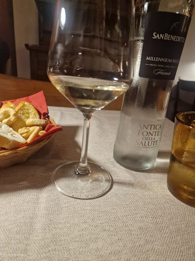 I made a reservation through fork app, one table, and one person for dinner. the welcome was super warm, and I was led to a table for 2 people in the middle of the restaurant. a pleasant atmosphere around and quiet at first, with quiet music in the background, as there were only 2 tables in the ground floor area occupied. during dinner, all the tables were occupied, and there was a background noise, a little disturbing. I ask first from a glass of proseco and sparkling water. The waitress brought me a cover (2 types of bread and some pretzels. Cover charge 3 euro. I asked the waitress what she recommended, and she was a little hesitant, but after she found out that I would like to try several dishes, we decided together. Green asparagus flan on parmesan cream and crunchy chips. Fresh grilled sea bass fillet with baked Treviso radichio and steamed potatoes. Of course, Tiramisu Another glass of proseco and an expreso All 60,3 euro Was very good and interesting plates. I recommend...