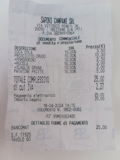lo scontrino invece parla da solo... 2€ per quattro foglie di rucola (costa 0,99 al supermercato), 2€ per letteralmente 5 scaglie di grana e 2,50€ una manciata di pomodorini... Far pagare praticamente una confezione da 500g di pomodorini al cliente lo trovo davvero di basso livello, per di più, se per l'aggiunta di ingredienti non viene riportato il prezzo sul menù e i camerieri non te lo comunicano quando lo chiedi. Ma posso anche sorvolare visto che i prezzi li decide il titolare. Però andrebbero comunicati.