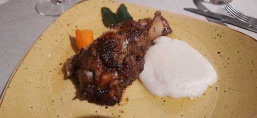 Come primo, una vellutata di zucca con castagne e ricotta affumicata: piatto equilibrato e ben presentato. Tra i secondi, guancette di maiale al ginepro e rosmarino con patate e uno spezzatino di guanciale di manzo al Refosco con cipolla di Tropea, accompagnati da un calice di Vertigo di Livio Felluga.