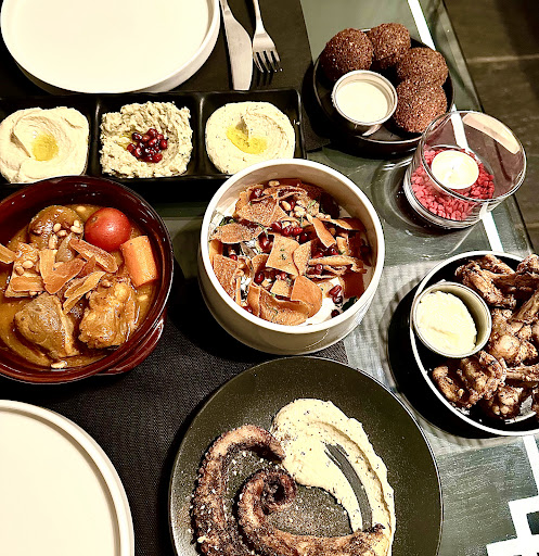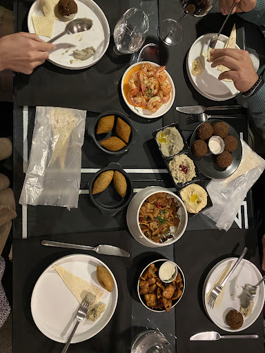 When you arrive they will give you an appetiser wine like a Prosecco maybe and then you may start your actual dinner. You have a variety of options to choose from and great vegetarian/vegan options as well. Their humus and baba ganoush is good. Very authentic taste. Their falafel, tawook, kibbeh. Everything is amazing. Portions are also not bad. At the end they give you a complimentary liquor or coffee.