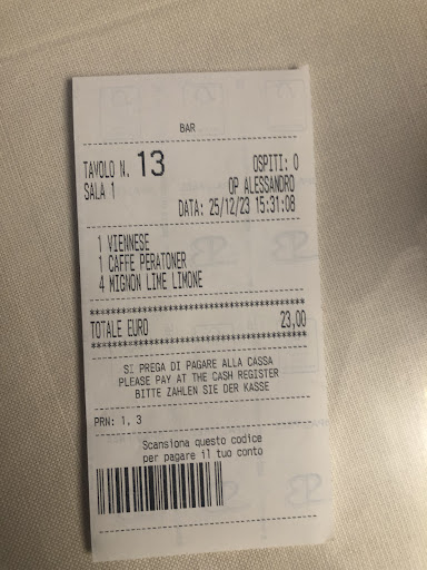 Read moreLady at the entrance (dark hair in her 40) was extremely rude and walking around talking to us in Italian. Such a high and expensive caffe and staff has zero manners. We told her we do not speak Italian and asked her if she can speak in English. she looked at us in a weird way and still didn’t care about it. Later she started arguing with us in English with an excuse she dont know which language we speak (well we spoke in English and I found it very rude and impolite towards customer I had no choice but to ask for a manager. (short guy, black hair and fair skin. Not sure if he was the real manager but he at least apologized. I am surprise by the behavior of the staff. I hope the owner will read the review and will take the necessary action. We were served by Alessandro. He was very polite and helpful (which should be the manager or at the entrance) We spent 23 Eur for 2 coffee and some sweets. I do not recommend this place because of their service (it’s not...