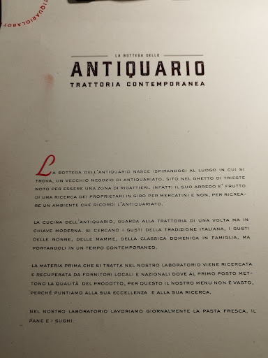 Read moreBased on a very interesting concept - old antique shop, this restaurant attracted us whilst we stopped over in Tristie as part of our European driving trip. We were able to bring our dog in as the restaurant is dog-friendly, which was excellent. The bread was served cold - if it was warm it would be better. I had three courses - cod chopstick as starter, pork rib as main and apple pie as dessert. Whilst the menu was fancy, I found all three of my dishes/courses average. I couldn't taste much of cod in the cod chopstick to be honest. The pork rib wasn't very nice I am afraid. The apple pie wasn't particularly tasty either. My partner had mozarella as starter and beef shoulder as main. They were actually very good. The service from the waitress was outstanding - well done! I really like the story about the restaurant and I feel if certain dishes can be revised and improved this would be a very...