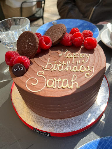 At the birthday we came to the nice outdoor area of Mugs and the waiter brought the extraordinary tasteful cake and two fine Cappuccinos.