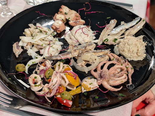 STARTERS: The homemade baccalà was the highlight of our dinner: its richness and creamy texture paired perfectly with the warm, freshly grilled toast. The seafood antipasti platter, however, presented a mixed experience—some seafood bits were slightly chewy and overwhelmed by a strong garlic taste.