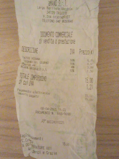 The courgettes were not cooked well ok you expect medicore food here but some were hot and others cold must have been carelessly stuck in the microwave. They did not taste fresh sausages like something out of the supermarket But the main issue was the rude waitress who refused to present an itemized bill . I sensed this was because they had sneekly added on a €3:00 extra charge for no valid reason I normally tip if the service is good . However I noticed they only ask the Italian clients if everything is ok and treat them with no contempt. Because I was not a local they took advantage and knowingly ignored my repeated attempts to get presented with the bill so I could check everything. The very unfriendly and hostile manager just ignored the waitress exploiting matters in a rude way . She also made threats . But now I have the receipt maybe I'll go to the authorities as I will certainly look to get back €3 not specified. I don't recommend and if you keep a record of all you...