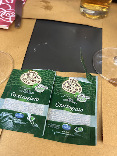 While I would have suggestions on making the menu easily readable, this is not the topic of this review. We ordered after a short wait, but the terrace was half full. It was a bit too much for one waiter, but he did his job. What confused me was that you get charged 2 euros just for sitting down, that's "the culture". Later, we ordered 3 pizzas and a beer and asked for some water. We were told we can order bottles at 3€/0.5l, the same ones or something similar, which is around 15 cents in the store. That's a 2000% price increase, are you insane? That wouldn't be a problem if they brought tap water on request, but that's not the Italian "culture". They brought us 3 small glasses of water to shut us up, but this "culture" where there is one price if you sit and another if you take it to go is pure greed and nothing else. Only seen in Italy. We won't be coming here ever again, and as I have the lucky job that lets me tell lots of people about this, I will definitely share this "cultural exchange" experience. Another thing worth mentioning is that while the food is good, the owner decided to cut costs in one more place. Cutlery is the name of the game. You get a knife with a plastic handle, with visible signs of wear. It's a bad Temu version, like I am sitting in a restaurant in the Albanian mountains surrounded by sheep and not on the busy restaurant promenade in Trieste. When the waiter served us, while friendly, he gave us the Italian menus. After asking for English one, he brought it, but it wasn't the updated version. Probably saving on costs again. One of the explanations for the water "culture" is that the restaurant has to pay for water, and that's the reason why they don't bring it to the table. Easy search tells me that the price for a 1000 liters is around 3€, so this is just another sad excuse to force you to pay crazy amounts for a small bottle of water on a hot day. This is a sad excuse for a culinary...