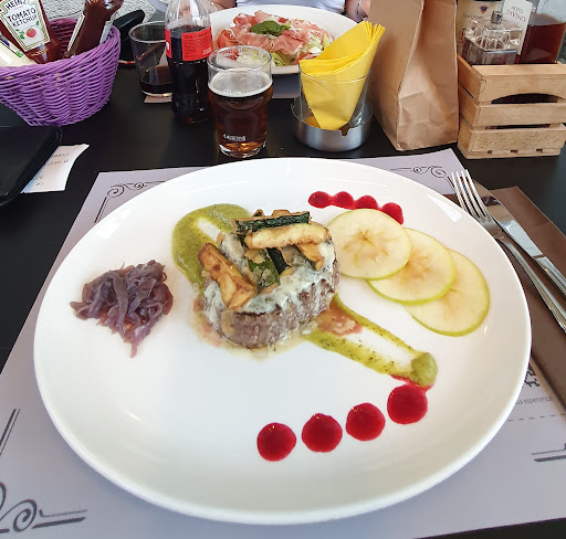 Read moreRecensione difficile da scrivere per questo locale... Premessa: ci siamo fermati a mangiare perchè avevamo fretta di cenare, i tavoli erano quasi tutti liberi ed un vistoso cartello recitava "il miglior hamburger di Trieste! (modestamente)". Abbiamo ordinato un piatto hamburger e una insalatona senza poter buttare l'occhio ai piatti dei vicini (non c'era quasi nessuno) e senza aver letto opinioni o recensioni sul locale quindi basandoci sulle nostre "sensazioni". Risultato: qualitativamente ottimo, proprio nulla da dire, quantitativamente siamo rimasti un pò delusi. L'insalatona aveva una buona base di insalata (iceberg) fresca, 4 fettine di prosciutto crudo e 4 pezzetti di mozzarella di bufala, pomodoro a fette e una bella cucchiaiata di salsa al basilico. Il piatto hamburger aveva l'hamburger con il formaggio roquefort sciolto sopra, 6 stick di zucchina, 3 fettine sottilissime di mela verda, 1 cucchiaino di cipolla caramellata (vedi foto). Non so se è il miglior hamburger di Trieste, certo è che è MOLTO ben cotto e MOLTO buono. Ma è altrettanto vero che 17€ per un hamburger e 6 pezzetti di zucchina son davvero tanti! Come son tanti 13€ per un insalatona nemmeno troppo ricca. Ad aver avuto tempo (o una dritta dal cameriere) sicuramente avremmo ordinato subito altro, magari un antipasto prima o un contorno, invece dovevamo scappare e, alla fine, siamo andati via con ancora un...