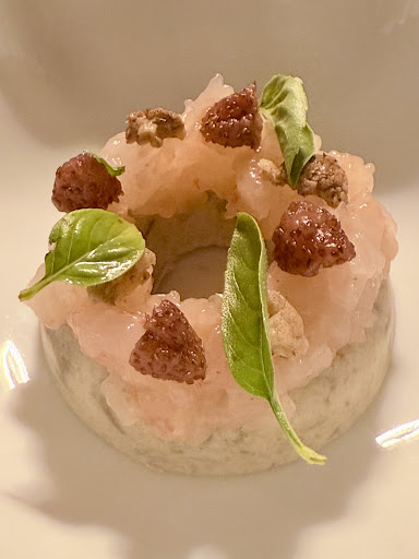 The first course, tarragon and yellow date tomato on pressed watermelon, was a nice, refreshing start with a well-chosen Vadduna Longa 2022 wine pairing.