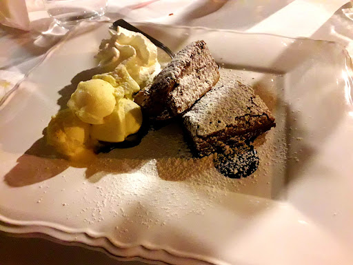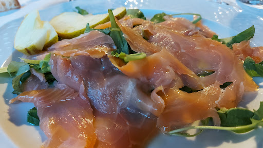 English===== Small but beautiful' is certainly applicable here. 5 tables inside and a nice covered terrace, although nowadays they also have a terrace in a corner of the Piazza Garibaldi, with a beautiful view over the lake. The menu is small with mainly local dishes and therefore a lot of fish, but also vegetarian and a filetto di manzo alla grilla are available, all very specially prepared. Example: carpaccio di salmone con mela 🍏! Surprisingly delicious combination, fresh tasting. Ask the waiter for a suitable wine: we got served a delicious fresh but full-bodied fruity rosato by Fiorda (obviously from Umbria, from cabernet grapes, 4 months in...