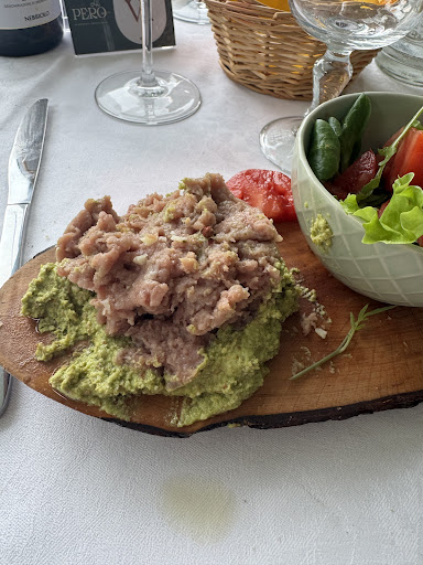 Tuttavia, una nota di forte disappunto va alla titolare del ristorante, Paola, per la gestione del menù concordato. Quanto ci era stato promesso in fase di prenotazione non ha assolutamente rispecchiato quanto poi servito a tavola. I taglieri di salumi e formaggi previsti si sono trasformati in semplici fette di salumi poggiate alla rinfusa su un piatto, accompagnate da pochi dadini di formaggio disposti senza alcuna cura. Le crudité di verdure con hummus, che ci erano state descritte e mostrate in foto con ben altra ricchezza e presentazione, si sono rivelate soltanto alcune strisce non particolarmente fresche di carote, sedano e finocchio, servite su un piattino con una sola coppetta di hummus condivisa tra più persone.