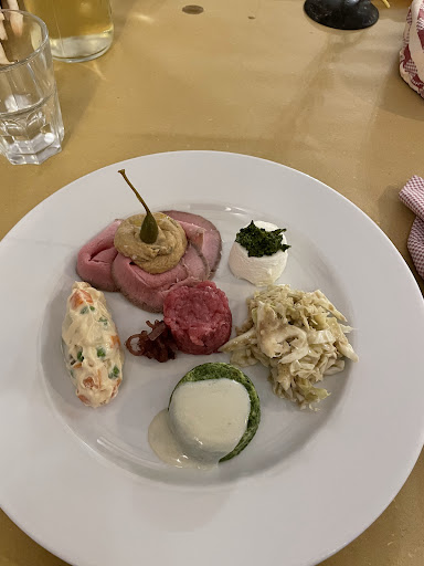 The menu started with a mix of appetizers, followed by a pasta course, and then a main dish of meat baked in wine, which was incredibly tender and flavorful. They also offered a dessert of the day. Everything was perfect, but the second dish was particularly outstanding. The staff was very friendly and spoke English well. They also offer menus in different languages. The environment and décor are reminiscent of a typical mountain restaurant, which matches the...