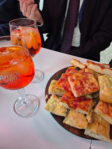 Read moreAllora parto col dire che la qualità è ottima, ma sono andato con 2 amici, abbiamo scoperto a nostro malgrado che ci è stato un aumento del prezzo di 2 euro minimo, ma vabbè, prendiamo comunque le porzioni di pizza con l'aperol sprizz, perché con il campari costa 9, le pizze e il tutto ci arrivano con 30 minuti di ritardo, ok locale mezzo pieno, ma vabbè, il fatto principale è che le pizze ci arrivano dure, alcune palesemente bruciate, e la varietà era pessima, solo pizzette bianche o rosse, 1 pezzo contato con il salamino e 1 con la melanzana, e basta, quindi va bene l'aumento ma almeno mettete varietà e mantenete la qualità, se le pizze vi vengono dure o bruciate perché state troppo nel forno non le servite, ce le portate con più attesa ancora, e piuttosto ci rimborsate, perché prossima volta se capita di nuovo, faccio le foto e vi faccio venire...