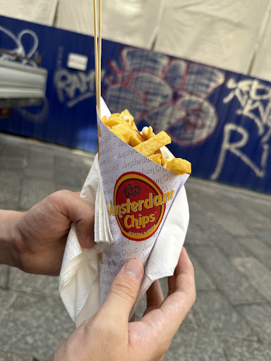 We were just having a family stroll down the street and my son saw the Amsterdam chips place and asked to try them. It was just a small shop front which wasnât busy. We choose the small size which I think was âŹ3! and he asked for the curry ketchup and pita sauce. The sauces tasted nice and the chips were fresh/chrisp and hot but nothing amazing to shout about. Being from England chips are pretty much a normal thing for us and these were just average really. I saw another couple buy a medium size and I wouldnât of said they had much more than us! The staff didnât really talk to us but itâs just one of those small shop fronts that you just pay and go...