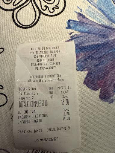 Sono stata in questo bar per prendere un caffè con un amico. Prima di uscire ho voluto acquistare dei biscotti di pasticceria secca. C era un’ampia scelta e quindi ho chiesto alla proprietaria di farmi un sacchetto misto per un assaggio variegato. L indicazione del prezzo segnato sui barattoli era di 26 eu al kg ma, quando è stato il momento di pagare,mi ha comunicato che avrei pagato 0,80 eu a biscotto e perciò ho speso per circa 10 biscotti la modica cifra di euro 13,60!! Vorrei sottolineare la poca trasparenza oltre all’incapacità della proprietaria del bar, senza considerare la mancanza di empatia… non sapeva neppure i gusti dei biscotti all interno dei barattoli e doveva sempre chiedere supporto alla socia. Lenta, insofferente ma ,soprattutto, disonesta!! Sconsiglio questo bar non per i prodotti o per la location che è perfetta ma per la mancanza di serietà e di scrupolo nei confronti dei clienti. Del resto qualche avvisaglia c era stata … bastava considerare il nome del bar… “ L atelier du Boulanger!… infatti non una pasticceria ma, visto il prezzo che ho pagato, veri e propri...