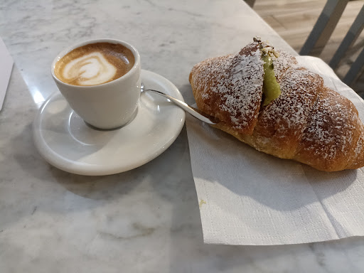 Nel complesso darei 3.5 stelle🌟 Il locale è davvero molto carino, arredato con cura. Siamo entrate all'apertura, alle 5:00, quindi quando le brioches stavano per essere sfornate. All'accoglienza ci siamo sentite come se fossimo in mezzo ai piedi, però comprendo un po' vista l'ora. Ho ordinato quella che ritengo essere la mia combinazione preferita per la colazione dolce: caffè macchiato e brioche al pistacchio. Il caffè molto buono ma la brioche al pistacchio davvero troppo pesante e dolce (e sembrava anche un po' stantia, il che è strano dato che le brioche sono cotte in loco, anche se quella che ho preso io in particolare era già tra quelle esposte), e il fatto che non ci fosse neanche un bicchiere d'acqua ha reso il tutto ancora più difficile da mandare giù. Il bagno è molto discutibile, soprattutto contando che non era ancora entrato nessuno. Prezzi nella norma, ho speso €2.30. Lo consiglio perché è uno dei pochi bar in zona aperti...