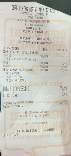 Read moreLa mia esperienza e molto negativa, Dopo aver ordinato tramite delivero alle ore 20 il mio ordine è arrivato alle ore 21 e l'ordine e uscito dal burger King alle ore 20 e 10 e per fare 2,7 chilometri a impiegato cinquanta minuti, naturalmente la roba e arrivata fredda e per di più ordinato 4 menù completi più i 4 gelati e mi hanno consegnato 3 menù e Al posto dei 4 gelati mi anno dato 3 KitKat quindi oltre che a mangiare freddo abbiamo dovuto fare la divisione dei pani e i pesci per mangiare in 4 al momento che ho chiamato per far presente dell'accaduto mi anno detto che avrebbero fatto il rimborso dello scontrino , che mi avrebbero chiamato per i dati per il rimborso passati un paio di giorni li richiamo e mi hanno detto si non si preoccupi le rimborsiamo lo scontrino ma non ce la responsabile la chiamiamo noi passati altri due giorni li richiamo e fortunatamente c'era la responsabile e mi ha detto sì mi dia i dati che facciamo il rimborso naturalmente do i dati e dopo un paio di giorni mi chiamano loro rimangiandosi tutto ciò che mi hanno detto e mi dicono che non potevano rimborsare l'intero scontrino ma solo ciò che mancava nell'ordine rispondo va bene almeno quello be' e passato un mese e ancora non ho ricevuto il rimborso, non è per i due soldi che mi devono dare ma e per principio. Questa e la professionalità del Burger King naturalmente lo sconsiglio vivamente tanto a centro metri c'è...
