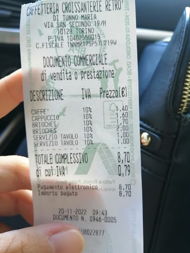 Read moreEsperienza da zero stelle per principio: h7.50, da sola in tutto il locale con i due baristi, 2euro una brioches e 1.60euro per un cappuccino, sullo scontrino appare in più 1euro per essermi appoggiata cinque minuti d' orologio ad un tavolo col mio zaino di lavoro sulle spalle mai tolto (tenendo conto che tazza, croissant etc me li sono portati e riportati da sola in quanto gesto spontaneo di gentilezza che rivolgo ovunque mi fermo a consumare una colazione "al volo"). Alla mia rimostranza per il rincaro, mi si fa notare che su un cartello con sfondo rosso sopra la macchina dei caffè c'è scritto che il servizio al tavolo è a pagamento (servizio non avvenuto comunque per eccesso di educazione mia probabilmente). Sarebbe bastato farmi notare per la volta successiva il cartello appeso e/o dirmelo sul momento, io avrei deciso se utilizzare la sedia o meno, e magari sarei tornata proprio apprezzando il "savoir faire" e l' onestà !!!!! Invece il risultato è stato ben diverso.....: immaginatelo, sicuramente ci azzeccate cari...