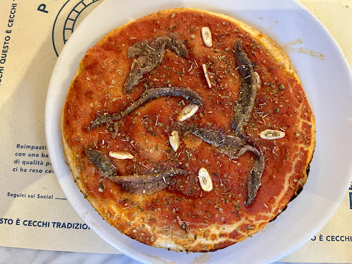 Farinata: Servita in tempi record. Buona e saporita, anche se personalmente la preferisco più sottile e croccante. Questa era leggermente più spessa, ma comunque gradevole. Pizza Marinara: Qui la sorpresa. È arrivata con le acciughe, trasformandosi di fatto in una "Marinara rinforzata". Il sapore era ottimo, molto deciso, anche grazie al supplemento di pomodoro e aglio che ho richiesto (costato 0,70 €). L'unico neo, secondo il mio gusto, è stato l'impasto: l'avrei preferito più soffice e digeribile. Comunque, nel complesso, una buona pizza. Servizio (Voto: 9/10) Le cameriere sono giovani, simpatiche e molto gentili, in linea con la fama di cordialità che Cecchi ha da sempre. Nonostante il locale fosse affollatissimo, il servizio è stato attento. L'attesa per la pizza è stata un po' lunga, ma è assolutamente comprensibile dato l'enorme volume di lavoro.