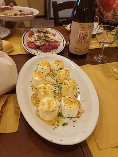 Un Tuffo Autentico nei Sapori del Piemonte: Un'Osteria Imperdibile! Questa osteria è una vera perla rara, un luogo dove la tradizione culinaria piemontese viene celebrata in ogni piatto con passione e maestria. Fin dall'ingresso si respira un'atmosfera calda, accogliente e genuinamente rustica, che fa sentire subito a casa. L'arredamento curato, con dettagli che richiamano la storia e la cultura locale, crea l'ambiente perfetto per un'esperienza indimenticabile. Ma il vero trionfo è in tavola. Il menù è un omaggio ai grandi classici piemontesi, preparati secondo le ricette tradizionali e con materie prime di qualità eccellente, selezionate con cura. Abbiamo avuto il piacere di assaggiare un vitello tonnato sublime, dalla salsa equilibrata e una carne tenerissima, seguito da agnolotti del plin fatti a mano, piccoli scrigni di sapore che si scioglievano in bocca, conditi magistralmente. Il brasato al Barolo era un capolavoro: carne succulenta, cotta alla perfezione, accompagnata da un sugo ricco e avvolgente che invitava a fare la "scarpetta". Anche i dettagli non sono lasciati al caso: il pane fragrante, l'olio d'oliva di qualità e una selezione di formaggi locali che raccontano il territorio. La carta dei vini è un altro punto di forza, con un'ampia scelta di etichette piemontesi, dalle più note alle piccole produzioni locali, perfette per esaltare ogni portata. Il personale di sala merita una menzione speciale: attento, cordiale, preparato e mai invadente, capace di guidare nella scelta dei piatti e dei vini con professionalità e un sorriso sincero. Lasciatevi spazio per i dolci: il bonet tradizionale è semplicemente divino, la conclusione perfetta per un pasto che celebra i sapori autentici e la convivialità. In sintesi, questa osteria non è solo un ristorante, ma un'esperienza che scalda il cuore e delizia il palato. Un indirizzo prezioso per chiunque cerchi la vera cucina piemontese, fatta con amore e rispetto per la tradizione. Consigliatissimo, non vediamo...