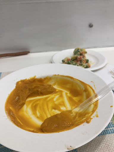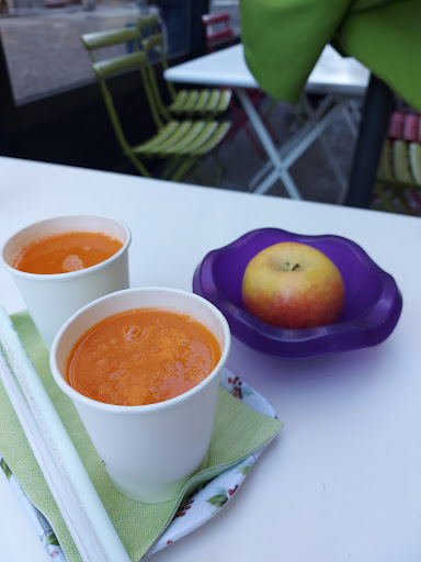This place has the best pumkin soup in the universe (sorry that the photo was taken too late I just could not resist it) one star because they use plastic and paper cutlery - not environmentaly friendly, and because it is overpriced, and it does not correspond with the taste, in fact the prices are like in michelin restaurant. I ate some seafood with cabbage, russian salad (photo) all small quantity and pumkin soup and paid 30 eur for it 😀 oh yes and a small...