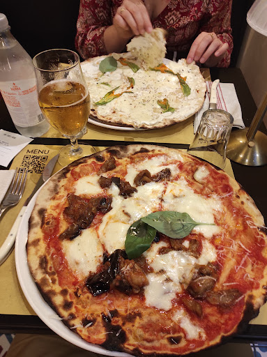 Sinceramente mi domando quale abile operazione di marketing ci possa essere dietro al successo di questa pizzeria/catena e al motivo di tante recensioni positive. Prenota telefonicamente un'amica, con cui condividerò una pizza pre teatro, per le ore 19,00. Un'ora prima l'amica riceve un messaggio, dove si chiede di cliccare su un link per confermare la prenotazione, ma...la mia amica, per filosofia di vita, non possiede uno smartphone e quindi non può cliccare su nessun link! Proviamo quindi a telefonare, per confermare, ma nessuno risponde al telefono...Siamo giunti al punto che è necessario avere uno smartphone, per andare a mangiare una pizza?? La cosa mi lascia alquanto perplessa. Arriviamo comunque in loco alle 18,40 ed una ragazza gentile ci dice che non ci sono problemi...bene, almeno abbiamo superato l'ansia che ci venisse annullata la prenotazione. Aspettiamo fuori tutti in coda, con una ventina di altre persone, che il locale apra, cosa che avviene puntualmente alle 19, ma vista la coda che si è formata, tra prenotati e non, ci vanno 10-15 minuti prima che ci facciano accomodare... vabbè, ci può stare. La ragazza che ci accoglie è comunque molto gentile. Ordiniamo subito, visto che avevamo già letto il menù fuori e, tempo 5 minuti al massimo, incredibilmente arrivano le pizze! Capiamo subito il motivo dei tempi così rapidi: le pizze sono fredde, soprattutto quella della mia amica, una bufalina senza lattosio, che si rivela essere un disco secco, tipo pane azzimo, con un velo di pomodoro e qualche pezzetto di mozzarella cruda...null'altro! Per il costo incredibile di 12 euro!! La mia capricciosa, che costa 13 euro, almeno è tiepida, visti probabilmente gli ingredienti che la farciscono, che avranno richiesto 30 secondi di forno in più. Certo...questa pizza secca se rimanesse in forno fino a diventare calda, risulterebbe una suola immangiabile!! L'unica cosa che riconosco, è che gli ingredienti della farcitura della capricciosa si percepiscono essere di qualità e questo è il motivo delle due stelle, che altrimenti sarebbe una. Idem per i dolci: freddi di frigo, la crostata sembra un gelato ed il tiramisù, oltre ad essere ghiacciato, non è neanche buono. Al tavolo alla nostra sinistra, le due ragazze parlottano tra di loro, dicendo che la pizza è fredda, mentre a quello a destra ci sono due signore che proprio non la mangiano, ne rimarrà nel piatto di entrambe più di metà. Mentre attendiamo di pagare alla cassa, un cameriere riporta dalla sala una bufalina uguale alla nostra, dicendo al pizzaiolo che il cliente ha chiesto di rimetterla in forno, perché è fredda, ricevendo anche lo sguardo perplesso ed infastidito del pizzaiolo... Fine del racconto: acqua piccola a 2,50 euro (!!), coperto idem (per una tovaglietta di carta ed ovviamente senza pane), pizze carissime, fredde e secche (ad entrambe piace la pizza sottile e scrocchiarella, ma questa non è sottile, è secca e basta!), dolci ghiacciati a 7 euro l'uno. Se questo è un locale di successo, mi domando davvero come ciò sia possibile, soprattutto notando la stessa insoddisfazione nelle persone nostre vicine di tavolo e come facciano ad avere tutte queste recensioni positive! Mi sa proprio che il marketing ormai abbia il potere di convincere le persone, soprattutto i giovani, a trovare appetitosi cibi non buoni e a prezzi assurdi. Da parte mia, l'unica conclusione che posso avere è: "Oh mi...