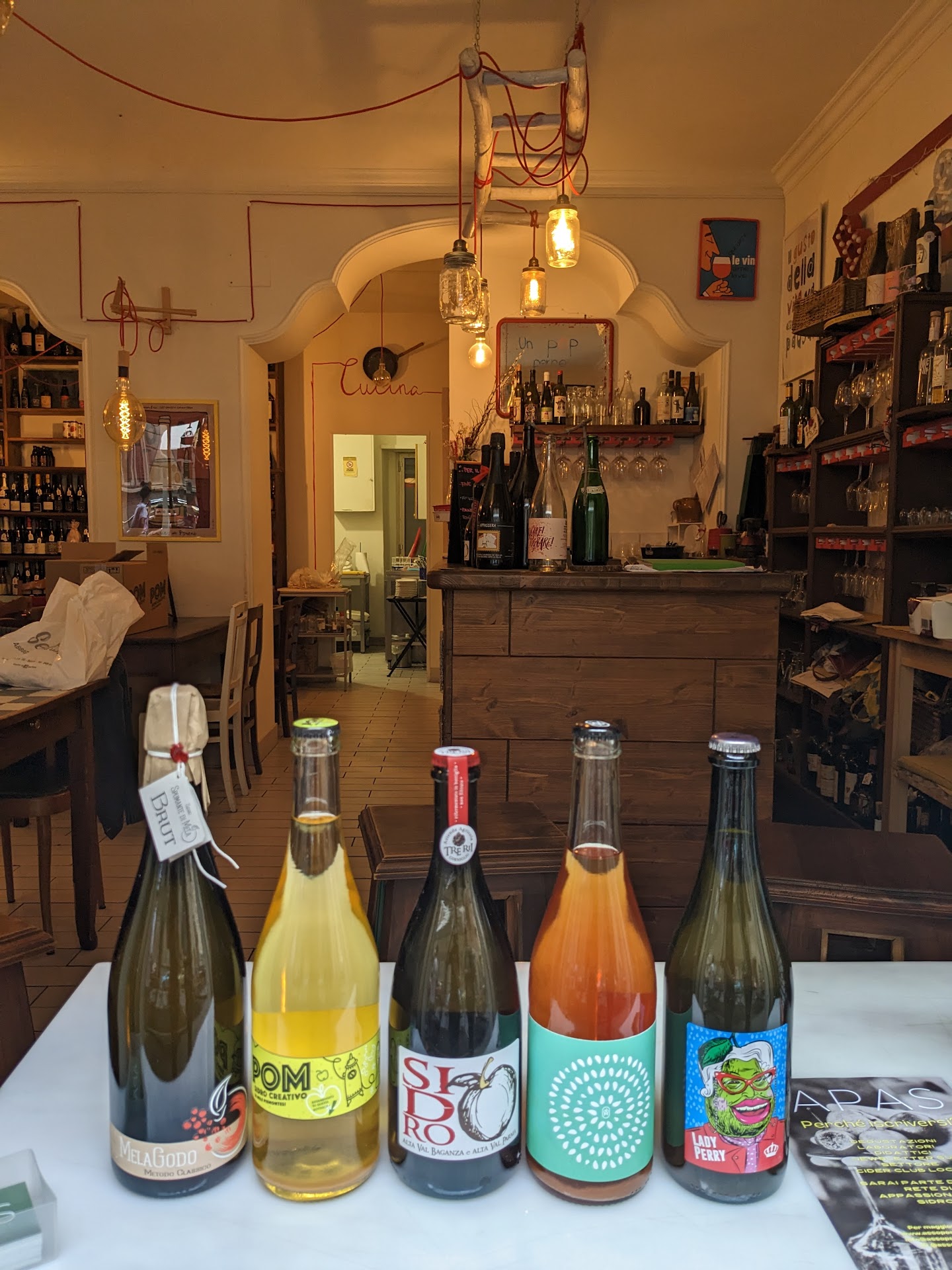 ESPERIENZA IRRIPETIBILE! Ordiniamo un tagliere di salumi e formaggi -sulla carta- per tre persone. Ne arriva uno che basta giusto per una sola. In pratica, tocca dividerci tra noi un assaggino di UNA sola fettina di salumi e formaggi pro-capite, tipo razionamento di guerra. Quando passa la cameriera o la titolare per sapere se è tutto okay, facciamo notare la cosa e lei molto "spiritosamente" risponde "ah, vabbé, me lo segno". Che simpatica! Finiamo in fretta la bottiglia di vino (con sovrapprezzo di 4€ perché consumata al tavolo, ma sorvoliamo...) e andiamo a pagare. Alla cassa, rimarchiamo alla titolare la questione del povero ma costoso tagliere e inizia una sequela di giustificazioni, del tipo che "comunque anche ordinando un tagliere per una sola persona a testa sarebbe toccato una fettina di salame, una di formaggio, una di coppa, ecc per ciascuno" e che "la scarsa quantità era compensata dall'altissima qualità dei prodotti" e, gran finale di supercazzole, "i prezzi sono alti e le quantità sono scarse perché c'è stato il COVID e ora c'è pure la...