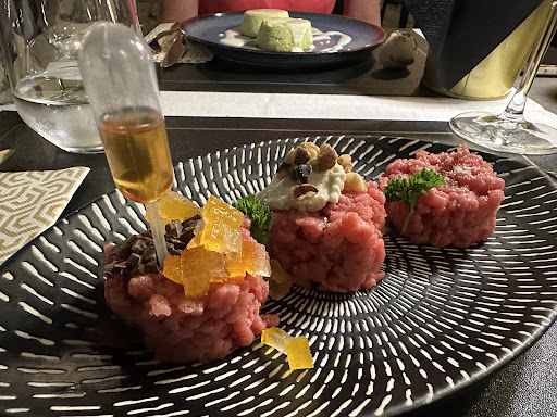 I got two dishes. The Tartare was mix of incompatible material. It was waste of meet, waste of chocolate and waste of Rum. The other dish Rigatoni was salty. It was saturated with salt to hide low quality taste of prime material. The decoration seems beautiful in photos, but when you get there everything is the plastic. The plants are artificial. The table is not stable and moves. The surfaces are not cleaned. The sofa in photo is just for decoration but not seating. It is made to seem luxury...
