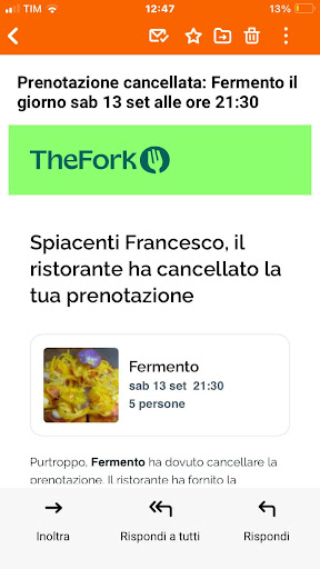 Inizio dicendo che la mia valutazione di 1 su cibo, servizio e ambiente non è reale ma dovuta al fatto che senza la mia recensione non verrebbe pubblicata. Avrei voluto scriverne una in cui parlavo di cibo, del locale, del servizio, di tutto quello che era possibile...invece devo parlare di come non sono potuto andare a mangiare in questa pizzeria (che gode di ottime referenze). Con amici abbiamo deciso di andare a Torino a vedere Juve-inter. Compriamo i biglietti aerei e stadio e poi io mi occupo, in quanto ex agente di viaggi, di dove dormire, mangiare e cose vedere. Sono attirato dalla pizzeria Fermento e decido di effettuare la prenotazione tramite The Fork (allego screen della conferma). Arriviamo a Torino sabato alle 14,44 arriva la mail (allego anche questo screen) da parte di The Fork in cui mi si dice che la pizzeria ha annullato la prenotazione. Naturalmente rimango molto infastidito da questa situazione, come i miei amici. Provo a chiamare per chiedere spiegazioni ma non risponde nessuno (la pizzeria apre di sera). Riusciamo ugualmente a cenare in un'altra pizzeria ma decido che devo rendere pubblico il tutto. Io non mi ritengo uno sprovveduto e so come funzionano queste cose (non voglio specificare qua) ma ritengo inaccettabile che mi venga comunicata la cancellazione di una prenotazione dopo 48 ore. Se la cancellazione fosse avvenuta nell'arco della giornata di giovedì avrei potuto capirlo, ma la tempistica è assolutamente riprovevole, così come lo è la giustificazione addotta. La pizzeria Fermento ci ha creato dei disagi e ha guastato l’immagine che mi ero fatta di loro. Mi auguro che queste parole siano di sprono ai gestori per evitare, in futuro, di avere così poca considerazione della clientela, che sono sicuro non rispecchia la qualità dei loro prodotti che, noi 5, avremmo voluto gustare decantandone la bontà.