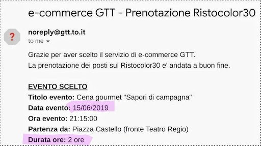 Read moreEro stata 5 anni fa a fare cena nel tram e l'esperienza mi era piaciuta tantissimo quindi ho deciso di ripeterla. Invece che delusione! La qualità del cibo non era stata un granché nemmeno nel 2019 ma adesso posso dire che si è abbassata considerevolmente; i prezzi invece si sono mantenuti alti. I camerieri dovrebbero fare un mini corso per imparare il mestiere, la cameriera mi ha messo in faccia la bottiglia di vino (al punto che ho dovuto tirarmi in dietro) quando versava il vino a mio marito. Ma il peggio in assoluto secondo me, quello per cui non meritano neanche mezza stella è la fretta che ti mettono nel mangiare: 4 portate in praticamente un'ora, perché il giro dura 80 minuti e finché il tram parte (e iniziano con gli antipasti dopo la partenza) e torna, si deve deglutire come matti per esserci nei tempi. Letteralmente appena finisci un piatto te lo portano via ed è già pronto in tavolo il seguente, infatti non sono riuscita a finire la lasagna perché ero piena delle portate precedenti ma magari se mi davano qualche pausa la finiva. Tornata a casa sono andata a controllare la prenotazione del 2019 perché avevo un ricordo molto diverso, ma magari sbagliato io ed era sempre stato così. Invece no, ho confermato che il giro prima durava 120 minuti e quindi hanno ridotto da 40 minuti il tempo! Per una cena, è tanto! Potete vedere nelle immagini allegati la prenotazione del 2019 e l'informazione del sito web di prenotazione di adesso dove si vedono...