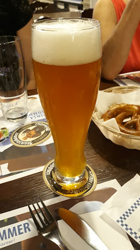 Read moreIl concetto di birreria alla quale siamo abituati è davvero differente, per questo il locale riesce a sorprendere sin da quando entriamo alla vista del personale in "costume" tipico della Bavaria! Il locale è davvero grande, ed oltre le sale interne ha un cortile privato per chi ama stare all'aperto così come una bella terrazzina. Nonostante lo spazio non manchi, la prenotazione nei giorni di punta è ampiamente consigliata, e questo la dice lunga sulla qualità del posto. Le proposte di cibo e bevande si rifanno altrettanto alla tradizione bavarese, dunque non mancheranno ottime patate al forno nelle varie declinazioni, wurstel e salsiccie di varie specie e varie cotture e sua maestà "lo stinco". Proprio sullo "stinco reale" è ricaduta la nostra scelta, e con una porzione (accompagnata da patate e crauti) si mangia abbondantemente e golosamente in due! Le birre son le classiche tedesche, non troppo complesse e "facili da bere". Il pretzel dolce con crema di nocciola ha chiuso la nostra cena: tutto buono! Riassumendo: -stinco patate e crauti -patate al forno speck e formaggio -pretzel dolce -4 birre TOT 45 € CIRCA. Più che giusto! Pollici...