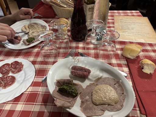 Read moreHo scoperto questo posto tramite ricerca su google, telefono per prenotare per il giorno dopo, giovedì per venerdì, mi dice che è tutto pieno e che ha posto non prima di 2 settimane. Prenoto! Questo per dire che conviene prenotare per tempo. All’arrivo ci fanno accomodare subito e troviamo sul tavolo già un piattino con del salame, grissini e pane! Pane non eccellente. Ordiniamo gli antipasti misti, buonissimi, ottima la lingua al verde, ma tutti in generale, ci arriva prima un piatto di antipasti freddi e a seguire uno dei caldi. Ho personalmente poi preso una tagliata, buona, carne tenera e cottura giusta come richiesta, accompagnata da spinaci. Poi chiedo consiglio al cameriere su quale fosse il dolce migliore e mi consiglia senza ombra di dubbio lo zabaione caldo! Spettacolare! Senza senso. Buono, grande, leggermente alcolico grazie al marsala, accompagnato da due fettine generose di crostata! Tornerei anche solo per il dolce! Nel frattempo il proprietario ci porta sul tavolo gli amari, offerti! Anche il vino sfuso, barbera fermo era buono! Detto questo, cibo ottimo, prezzi introvabili in giro, davvero competitivi. Tornerò per assaggiare tutto il resto! Unica nota dolente, un pò fastidiosa è il rumore in sala, davvero davvero forte, un vociare troppo persistente che ci costringeva ad alzare il tono di voce per capirci al tavolo. Potrebbero risolvere in parte con pannelli fono assorbenti sul soffitto. Morale: finalmente ho trovato un posto che ne vale davvero la pena, cibo ottimo, di qualità a prezzi...