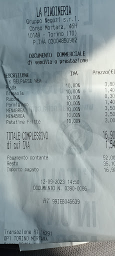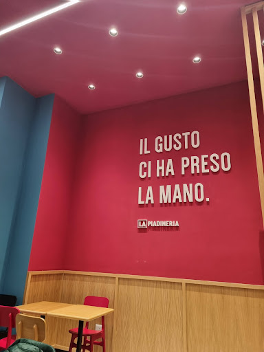 Read moreNon mi piace lasciare recensioni negative ma quando ci vuole .... Noi abbiamo ordinato tre piadine di cui due con prosciutto crudo e stracciatella, a parte il fatto che di stracciatella c'era appena un cucchiaino al centro, il prosciutto con pezzi di cotenna immangiabile buttato lì a mucchietti solo su alcune zone della piadina, pomodori ... due spicchi Il peggio è stato trovare dentro la piadina ben due pezzi di plastica bianca Ma forse ancora peggio è stata la risposta della signorina a cui ho segnalato il problema che mi ha risposto con aria beata : si deve essere il prosciutto.... come se fosse già a conoscenza del problema. Senza preoccuparsi minimamente che noi avevamo pagato due piadine per buttarle quasi intere nella pattumiera oltre al rischio di rompere un dente e al problema igienico Tra pezzi di plastica e cotenna onestamente non c'è l'abbiamo fatta a mangiarle . In genere negli altri locali della stessa catena non abbiamo mai avuto problemi e spiace tale situazione visto che è un nuovo locale Io...
