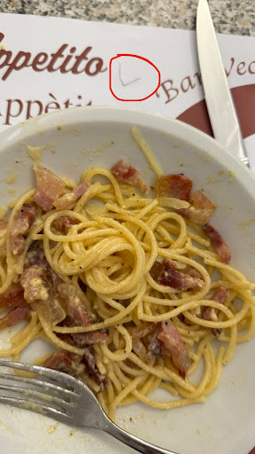 Stavo per ingoiare il pezzo di metallo, ma almeno ho avuto la fortuna di tirarlo fuori. Inoltre, la carbonara non era buona “sembrava che la crema è stata fatta con la pana” e il guanciale era crudo.