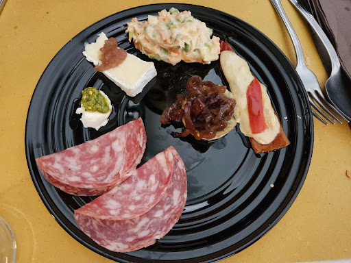 Cibo Antipasti misti (assaggi): molto misti, molto vari Ottimo: toma e caprino con miele e granella di noci Buono: lardo con miele e granella di noci Buono: Tonino elettrico, peperone in bagna cauda, battuta con bagna cauda Discreto: salame cotto Mocetta: che c’entra?