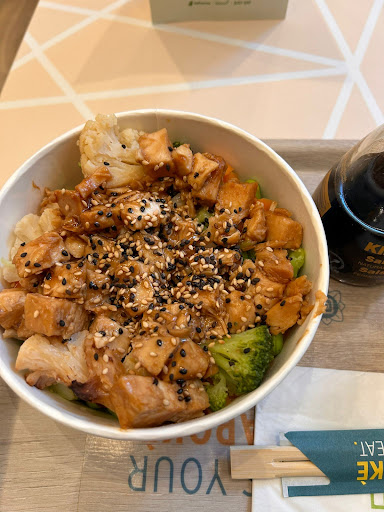 Ma la nota dolente che causa le poche stelle è dovuta alla ragazza che ci ha "accolto". Eravamo appena sull'uscio e già lei incominciava a spiegare come funziona il locale e l'ordinazione, senza neanche permetterci fisicamente di sentirla, tra musica e rumore che veniva da fuori. Non un sorriso o un gesto di cortesia per accoglierci, ma la consegna fredda dei menu dell'eventuale foglio da compilazione, per poi rivolgerci subito le spalle. Quando abbiamo intuito che così funzionava, ci siamo alzati e siamo andati da lei. Pagamento veloce senza neanche guardarci in faccia, e poi di nuovo le spalle, operando per gli ordini. Dopo un po' di tempo arriva il vassoio col menù, che viene lasciato al tavolo senza nessuna spiegazione: casualmente avevamo le ordinazioni molto simili tra di loro e non tutti possono essere esperti da ricordare il piatto o saperlo distinguere, visto che viene servito uguale. Alla nostra richiesta di indicarci almeno il poke principale, ci viene data una risposta sommaria, fredda disturbata... (ci siamo poi accorti, osservando anche gli altri clienti venuti dopo di noi, che il modus operandi in stile robotico si perpetuava sempre uguale)