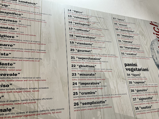 Il menu offre una varietà di panini che spaziano dai classici con salumi italiani, come il prosciutto crudo e la mortadella, a creazioni più elaborate con ingredienti come formaggi locali, salse speciali e verdure di stagione. Ogni panino è un capolavoro, preparato con pane fresco e farcito generosamente, garantendo un equilibrio perfetto tra sapori e consistenze. È possibile anche personalizzare i panini scegliendo tra diversi tipi di pane, ingredienti aggiuntivi e salse, rendendo l'esperienza ancora più su misura per il cliente.