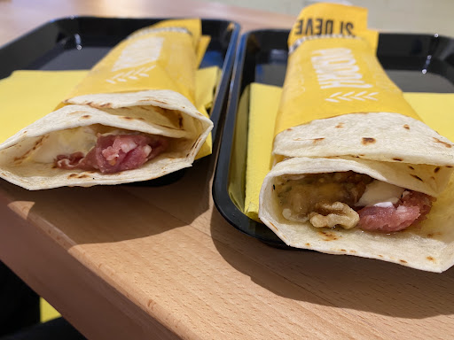Ragazzi siete pazzeschi! La migliore piadina che io abbia mai mangiato. Abbiamo ordinato due piadine, una con prosciutto cotto, lattuga, mozzarella e pomodoro (impasto classico) e l'altra con impasto di farro farcita con stracchino, cavolo viola e funghi porcini. Erano entrambe STRE-PI-TO-SE! Da leccarsi i baffi veramente. Due piadine più due bibite le abbiamo pagate appena 16€, erano farcite al punto giusto, servite tiepide non eccessivamente calde. Vasta gamma di bibite fra cui scegliere incluse le versioni "zero" di estate e coca cola. Personale gentilissimo. Bagni puliti. Noi abbiamo pranzato all'interno sui tavolini appositi tuttavia c'è anche possibilità di farlo fuori all'esterno. Unica pecca forse il fatto che non diano le posate per mangiare la piadina ma solo il vassoio, tovagliolini, bicchiere e cannuccia (se richiesti), però comunque su esplicita richiesta hanno tagliato la mia piadina. Ottimo l'impasto di farro, non pesante né eccessivamente salato. Soddisfattissima della mia scelta veramente! Servizio rapidissimo. Prezzi molto economici. Menù completo e molto vario. Staff cordialissimo. Semplicemente spaziali! Consigliatissimo, una magnifica scoperta, più che piacevole, a Torino! Correte a provare le loro...