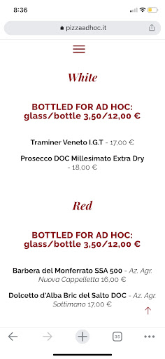 Ad Hoc Pizzeria is located on a quiet street in the center of Turin. The interior is interesting, but we dined on the small terrace. The staff is hospitable, and the prices are reasonable. With more than 20 different pizzas, they also offer salads, burgers, as well as a variety of beers and wines.