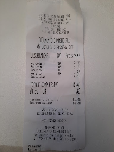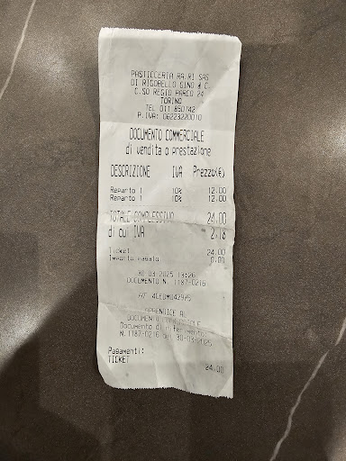 Read moreCapito casualmente per la prima volta a prendere un caffè in questa bella pasticceria torinese. Il caffè con mia sorpresa è eccellente, uno dei migliori mai gustati: giusto grado di amaro, aroma equilibrato e schiumetta perfetta. Faccio i complimenti alla titolare chiedendo se lo vendono anche. La sig.ra è gentilissima e alla mia richiesta di acquistarne due o tre etti mi fa confezionare un sacchettino con caffè appena macinato per assaggio che mi regala. Completa il quadro il titolare che arrivato nel frattempo mi spiega gentilmente che selezionano 7 varietà di arabica e provvedono alla tostatura direttamente. L'ho provato a casa con la macchinetta ed è il migliore che abbia mai sperimentato. E' bello ritrovare nelle attività artigianali a conduzione familiare tanto passione di chi si distingue ancora per classe, savoir faire e alta qualità. La prossima volta passerò anche al settore...