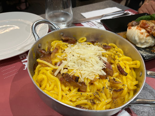AGGIORNAMENTO sulla base della vostra gentile risposta: ho chiesto al cameriere che mi ha servita non una, ma ben due volte di rendere il guanciale croccante. Dopo avermi negato tale gentilezza, ha fatto venire un altro cameriere a ribadirmi la stessa cosa, sottolineando che il guanciale fosse precotto, e alla mia richiesta di fare una eccezione solo per me mi è stato risposto che non era possibile in quanto viene fatto in grandi quantità e che quindi o mi accontentavo o cambiavo piatto (ero venuta da voi SOLO per la carbonara...) E aggiungo che, mi era anche stato proposto di provare il guanciale "molle" per assaggiarlo, prima di far uscire il piatto di pasta, in modo da non sprecare eventualmente il cibo. Spoiler: dopo due minuti mi arriva il piatto... Per quanto riguarda il panino, il problema non era il pane in sè, bensì il pollo croccante e la dimensione dello stesso, nello specifico (come si evince dalle foto). Però nessun problema, mi spiace ma non tornerò più. Lavoro a contatto con il cliente da tutta la vita e la felicità di chi mangia ai vostri tavoli dovrebbe venire prima di qualunque altra regola o prassi. Buona continuazione!
