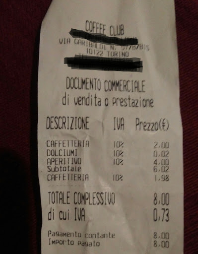 Read moreUn caffè (1,2 €), un ginseng (1,4 €) come da prezzi in lavagna esposta sopra la cassa e un bicchiere d’acqua 50 centesimi per un totale di 3 euro e 10. Al momento del pagamento (4,5 €) i conti non tornano, chiedo spiegazioni e mi viene detto che per il servizio fuori si paga un supplemento di 50 centesimi per ogni cosa portata! Quindi il cameriere fa un viaggio e con 3 cose guadagna 1,50; in sostanza un caffè costa 1,70 un ginseng 1,90 e un bicchiere d’acqua 1,00! Un furto se si valuta la posizione del bar; e comunque i conti non tornano perché avrei dovuto pagare 4,60 se ci fossimo dovuti attenere alla regola del pagamento del supplemento di 50 centesimi per ogni prodotto richiesto. Comunque nello scontrino non è stato battuto il prezzo singolo di ogni prodotto consumato ma è stato battuto il prezzo totale di 4 euro e...