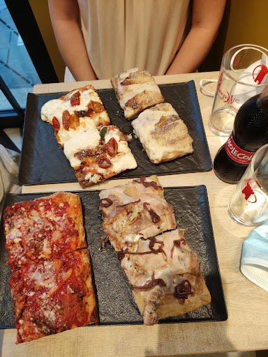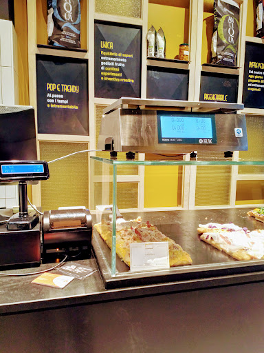 Locale non molto grande, consigliabile prenotare in anticipo (tavolini molti piccoli e panche un po'scomode...): il locale è stato disponibile a fornire un seggiolino per bimbi e a prendere in considerazione un'eventuale aggiunta di un commensale. All'inizio non si comprende bene quale sia il metodo per ordinare e ritirare l'ordine, ma la ragazza al bancone ci ha spiegato gentilmente come organizzarsi. Pizza al taglio gourmet buonissima: impasto leggero, condimenti molto saporiti e abbinamenti gustosi. La possibilità di ordinare tranci di pizza a peso permette di poter crearsi una piccola degustazione. Una sola scelta per il dolce (ma d'altronde non si è in un ristorante). Le pizze hanno un costo al Kg ovviamente elevato visti gli ingredienti e la qualità dell'impasto, ma tutto sommato buon rapporto qualità/prezzo e quantità/prezzo. Il locale si presta principalmente per una aperitivo o cena in coppia, non di certo per comitive numerose. Gli spazi stretti, il fatto di dover alzarsi a ritirare la consumazione e servirsi le bevande o comunque ritirarle al banco, rende l'esperienza un po'meno confortevole e più simile a quello che è uno street-food. Ad ogni modo, una pizza squisita che va assolutamente assaggiata. Consiglio per la direzione: la ragazza al banco, per quanto molto competente, in alcuni momenti sembrava un po'sovraccarica, forse sarebbe meglio aggiungere un cameriere di supporto, il che potrebbe contribuire a rendere l'esperienza più piacevole...