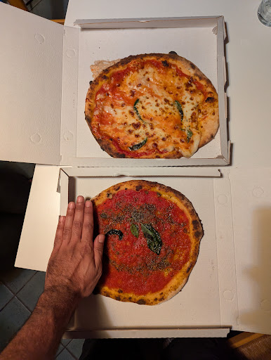 Read moreHo preso due pizze da asporto pochissimo fa, non posso utilizzare la parola "truffa" perché i prezzi sono bassi ma basta guardare la foto per capire che la Pizza è una cosa mentre i dischi di pasta lievitata male che producono un'altra. Le pizze sono piccole e troppo basse, il sapore dell'impasto non è quello che dovrebbe essere e anche il pomodoro non è saporito come dovrebbe. Nella marinara non ho percepito l'aglio, la lingua, gli occhi e il naso non hanno rilevato nulla e sbagliare la marinara è proprio grave. I tempi di consegna sono stati quasi immediati, è stata l'unica cosa positiva. In breve, quindi, questo attività pensa di fare la pizza ma il risultato è in linea con la media attuale dei kebabbari che, a quanto pare, fanno vergognare posti che sembrano napoletani ma non lo sono per niente. State lontani da questo posto e seguite la tradizione, la Pizza è ricerca e passione e non un modo per tirare a campare prendendo in giro i clienti.