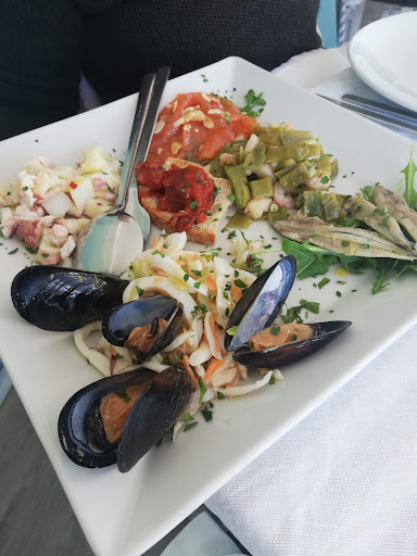 Обратили внимание на закусочную при парковке машины и решили пообедать.Встретили дображелательно и предложили выбрать столик по желанию. Обслуживание достаточно быстрое,но вместо 1/4 вина принесли 0,5... Белое домашнее вино оказалось отличного качества. Не хотелось начинать с замечаний,что одна из вилок не сияла чистотой и просто обошлись одной,благо заказанные блюда позволяли. Закуска из 5ти небольших гренок неоправданно дорогая на мой взгляд(три с семгой тунцом и анчоусами еще ничего,понравились). Первое блюдо спагетти с моллюсками и морскими ежами(speghetti alla vongole con ricci di mare)было пересоленым и заявленные морские ежи, не ощущались ни на вкус ни визуально,хотя шеф,принесший тунец, пытался убедить нас в присутствии в тарелке этого ингредиента...Спорить не стали,не хотелось портить настроение.Но состав блюда (а соответственно и вкус не тот) не соответствовал заявленному в меню! Второе блюдо, тунец на гриле (tonno alla braccia) было бы на отлично,но опять эта соль! Видимо шеф повар влюблен :) Рыбное фри ассорти было щедрым но состояло всего из кальмаров и 4х креветок. В целом,наелись,но...