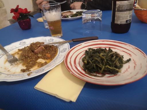 Comincio con il dire che i rigatoni all'amatriciana erano ottimi e lo chef (presumo che sia anche proprietario) all'apparenza simpatico. Su suo consiglio tre di noi decidono di prendere salsiccia e fagioli come secondo... salvo poi trovarsi davanti un piatto immangiabile con la salsiccia ancora abbastanza cruda al centro e il sugo che sapeva di vino, presumibilmente per coprire la scarsa qualità della carne. Anche le scaloppine al limone prese da mia madre di dubbia qualità con carne palesemente andata a male.