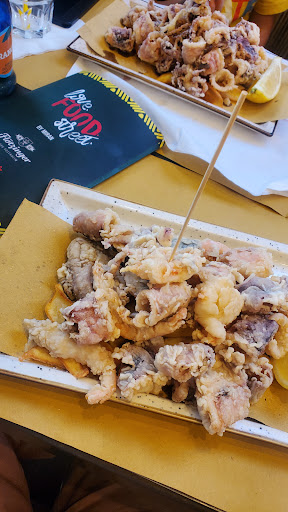 Read moreLocation carina con tavoli all'aperto composti da sgabelli e qualche tavolo con panche. Premettendo che c'era molta gente, il sevizio è stato gentile anche se decisamente lento, probabilmente causa il personale insufficiente: una persona che prende gli ordini, una che porta i piatti, una al bancone ed una figura da jolly per aiutare chi restava indietro. Ma Il cuore del problema era in cucina: in 4 di loro, lenti, per fare del fritto mal cucinato e impressionantemente unto ed I panini mezzi crudi dal gusto discutibile. Il conto onesto
