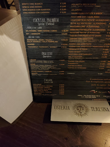 Passeggiando per il centro di Udine mi trovo davanti l'osteria da Teresina !!! La mia mente fa subito un salto all'indietro, si parla del 1980/90 quando in piazzetta Bolzano c'era l'omonima osteria da Teresina, si parla dell'osteria tipica del periodo ove persone semplici disponibili educate facevano questo mestiere, il mestiere di far star bene le persone che portavano i loro denari nelle loro casse dando loro un buon bicchiere e le cose semplici che si davano all'epoca ma rigorosamente fatte in casa e...sempre una buona parola verso il cliente. Oggi entro per la prima volta in questo locale del centro e solo nell'ordinare due bicchieri alla svampita incapace, per nulla professionale resto a dir poco inorridito e per giunta prendo anche dell'arrogante, per aver fatto notare all'incapace che chiedendo una bollicina Brut, non può rispondere, abbiamo il Val d'oca oppure la ribolla!!! Ignara e convinta del fatto che io sia lo svampito e lei la sommelier e che ciò che chiedevo fosse un invenzione del momento . Allora signor titolare formi questa persona ,spieghi o le doni un vademecum del comportamento che dovrebbe avere uno che lavora in ambito somministrazione ( servizio) le paghi un corso di sommelier così evita di fare figure come ha fatto oggi di insignificante saputella quando per aprire una bottiglia ha dovuto ricorrere all'aiuto del collega. Inoltre come dulcis in fundo la renda dotta di chi contribuisce al regalo che riceve a fine mese per le sue prestazioni lavorative ove fa più danno che profitto....